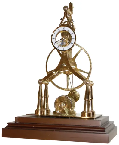 Skeleton Clock, modern Asian lacquered brass reproduction, in glass and wood case, late 20th century this decorative modern repro, with its fusee and oversize great wheel echoes rare English models from the 19th century. It is in nearly-new condition, but we did not test its operation. Ht to top of case 17"