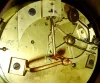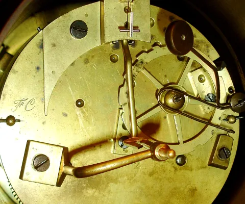 Case dirty and with minor discoloration, left and right corners of cornice molding broken and repaired, upper case sections have been separated and rejoined, gilding good with minor losses, one foot a bit loose, pendulum missing back, steel components in gridiron with minor oxidation, dial with wear and minor losses, hands with oxidation, movement ticks and strikes, hole in tip of center arbor for minute hand taper pin plugged, will need to be cleared to fit new pin, Ht 17 1/4"