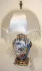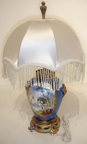 German "Koma" 8 days, timepiece mounted in painted porcelain and gilt metal electric lamp with old cut glass bulbs and cloth shade, early 20th century