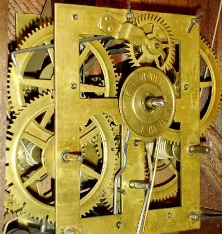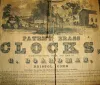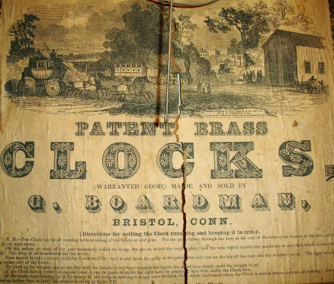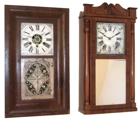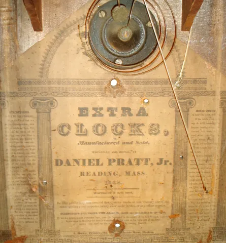 Clocks- 2 (Two): Daniel Pratt, Jr, Reading, MA 30 hours, weight driven time and strike, wooden works half column and splat shelf clock, c1842. The second clock is a Chauncey Boardman, Bristol, Conn.30 hours, weight driven time/strike/alarm OG clock, c1847. The Daniel Pratt clock has a refinished mahogany veneer case. The original painted dial shows wear. The hands are original. Both the mirrored tablet and stenciled top glass are original. The case has a nice dated (1842) label. Ht 28.5". The Chauncey Boardman clock has a mahogany veneered case with a dark finish. The painted dial is original and the hands are original. Both glasses are original. The lower glass may be a Fenn glass and shows flaking and lifting. The interior label is excellent. Ht26"