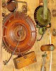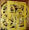The Daniel Pratt clock has a refinished mahogany veneer case. The original painted dial shows wear. The hands are original. Both the mirrored tablet and stenciled top glass are original. The case has a nice dated (1842) label. Ht 28.5". The Chauncey Boardman clock has a mahogany veneered case with a dark finish. The painted dial is original and the hands are original. Both glasses are original. The lower glass may be a Fenn glass and shows flaking and lifting. The interior label is excellent. Ht26"