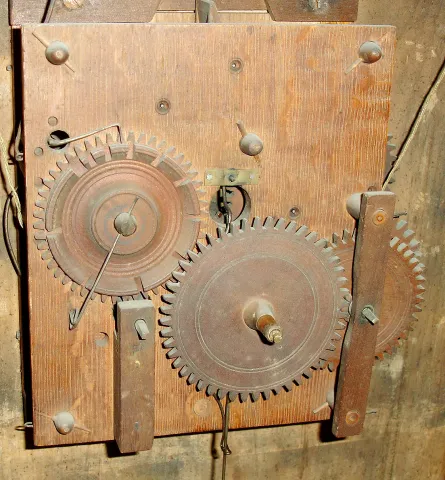 Unknown, (possibly a Jerome, Darrow & Co.), Bristol, Conn., 30 hour, time and strike, weight wood "groaner" movement, reeded pilaster & scroll top shelf clock, c1824