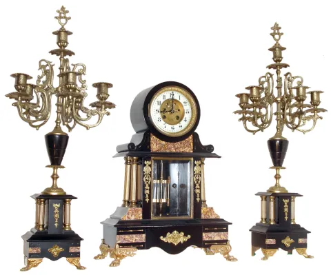 France, 3 piece mantel garniture, black slate drumhead case with columns and inset contrasting marble panels, the case front with beveled glass, applied gilt spelter ornament and animal paw feet, Arabic numeral white enamel dial with sunken center, signed "Philippe & Boisseri Rouen", Brocot open escapement, blued steel hands, 8 days, time and strike, Pendule a Paris movement signed Marti, faux mercury pendulum, with two candelabras of matching materials, design and ornament, c1880 Case with possible repairs, some slate has been painted black, some ornaments regilt or repainted and reattached to the case, not all ornament sits flush to case surface, glass in case front glued in place and with excess glue on exposed surfaces, dial with hairlines at 9:00 - 10:00, hands painted black, pendulum replaced, movement ticks and strikes, candelabra with chips and flakes, one with larger chip at right front corner, and replaced rear feet, candleholders and supports painted, some with minor bends, clock Ht 181/2", candelabra Ht 25 1/2"