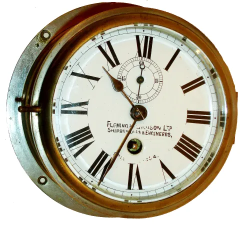 English engine room clock, nickel plated brass case with beveled glass, Roman numeral white enamel dial marked "Fleming & Ferguson Shipbuilders & Engineers Paisley" (Scotland), blued steel hands, round 8 days, fusee timepiece with lever platform, the plates with decorative scraping, c1900 case dirty and with minor losses to plating, minor dings and scratches, left side with waves from removed dent, glass with minor scratches, dial with minor scratches, movement very oily, starts immediately when wound, a cleaning wouldn't hurt, mounting flange diameter 8"