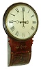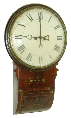English, 8 days, time and strike, fusee brass movement mahogany with brass inlay wall or tavern clock, c1860 Mahogany veneered case with loss of some of the brass inlay on the curved bottom, veneer repairs on the bottom edge, some loss on the flat strip above the bottom door, a veneer blister near the right side piece and a stress crack on the left. The turned mahogany bezel has suffered three shrinkage cracks. Original painted dial is rather nice for its age with some minor loss on the edges. Unusual hands look to be original. The pendulum bob is not original, but new ones are available. Nicely made heavy plate cable drive fusee time and bell strike movement. Ht 28.5"