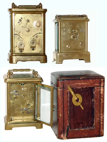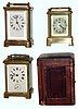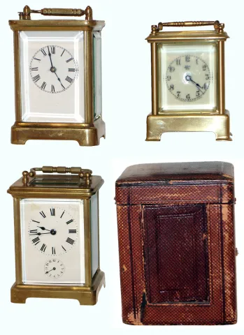 Clocks- 3 (Three) brass and beveled glass carriage clocks: French 8 days, time and alarm in original leather travel case; Waterbury "Conductor" 30 hours, time only; Waterbury "Sage" time, alarm and repeating strike; early 20th century