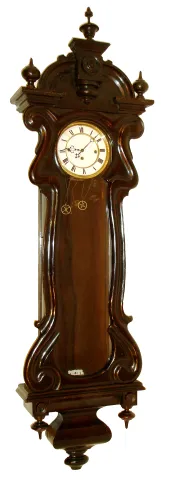 Vienna Regulator, Grande Sonnerie, 8 days, time and grande sonnerie strike, three weight driven movement in an ebonized serpentine case, c1870 the case retains its fading original finish. The dial has a repair between 10 and 11 and other hairlines. The pendulum, weights and one pulley absent. Ht 61"