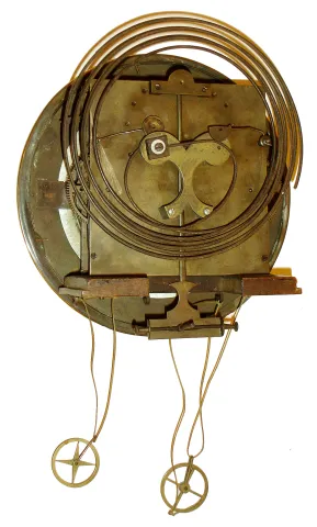 the case retains its fading original finish. The dial has a repair between 10 and 11 and other hairlines. The pendulum, weights and one pulley absent. Ht 61"