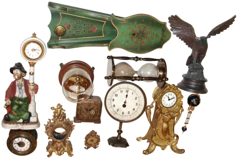 nice grouping of interesting clocks, mostly in good condition. The battery-powered whistler includes its original box. No additional information available.