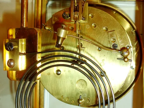 French crystal regulator for Camerden & Forster, New York, gilt brass case with beveled glasses, Roman numeral white enamel dial, decorated with a cherub bearing a garland of flowers, gilt hands, faux mercury pendulum, 8 days, time and strike, Pendule a Paris movement marked S. Marti, c1900 case with dirt and spotting, front and side glasses with corner flakes/ chips, dial with minor marks/ scratches, minute hand repaired, short, pendulum good, ticks and strikes, Ht 9 3/4"