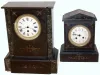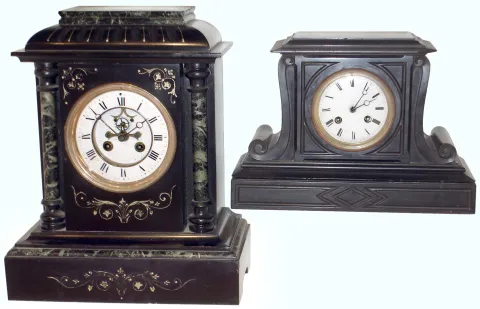 Clocks- 4 (Four) French black slate and marble 8 days, porcelain dial mantel clocks: one time only; three time and strike, late 19th century the largest has a single-train unsigned movement, and the absent front green marble trim pieces are included inside. The next largest is the best, with jeweled visible escapement and full marble columns. One of the two smaller clocks has a Japy movement, the other's back plate has "J.E. Wood" stamped on it. The cases mostly are complete but there are some chips and losses, and there is only one pendulum with the lot. Hts. are 15", 11" and 9". Sold as is, no further details available