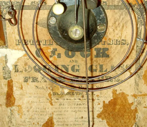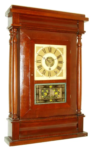 The mahogany veneer case has been refinished and there are several areas where veneer has been replaced or veneer chips remain. The dial is original but has had some restoration. The hands are later replacements. The bottom glass is original but has some flaking. The movement is unsigned. The label inside the case indicates that the firm of Pettibone and Peters in Brooklyn was a manufacturer of clocks and looking glass frames. This is a very unusual NY Style 4 column clock in terms of its size, design and the use of an 8 days, weight time, strike and alarm movement.