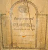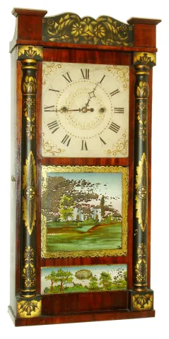 Mahogany veneered case in original finish in nice condition with small veneer chip on the door. There is exceptional stenciling on columns and superb glasses, flaking but worthy of restoration. Dial glass is cracked in the lower right corner. Original wood dial with a little wear to the spandrels and the chapter ring. Original hands. Nice label inside the case. Ht 35"