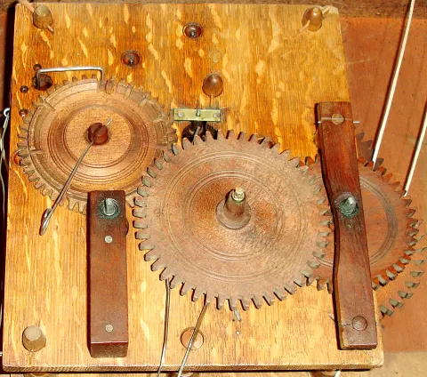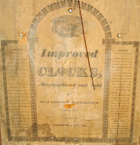 Eli & George W. Bartholomew, Bristol, Conn., 30 hours, time and strike, weight "Groaner" wood movement half column & splat shelf clock, c1830 Mahogany veneered case in original finish in nice condition with small veneer chip on the door. There is exceptional stenciling on columns and superb glasses, flaking but worthy of restoration. Dial glass is cracked in the lower right corner. Original wood dial with a little wear to the spandrels and the chapter ring. Original hands. Nice label inside the case. Ht 35"