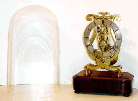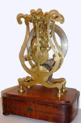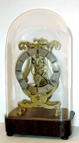 English, a single fusee skeleton timepiece, with a simple solid brass chapter ring, in a "Lyre" style frame, and with robust baluster pillars, on a rosewood veneered base with glass dome, c1860 This is a robust but modest quality clock, that has main wheels, each with 4 tapered spokes, and the side motion gears are solid with no spokes. There was perhaps a chain to the fusee originally, now cable. The glass dome is in good condition, and the clock ticks Ok. Ht 13"