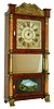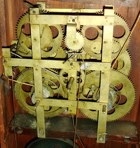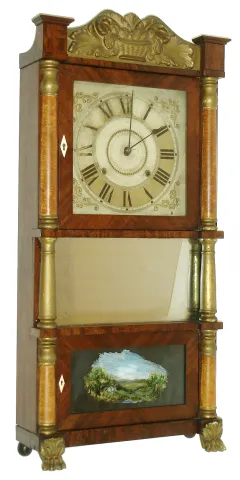 Mahogany veneered case in nice condition in an old finish with some minor loss on the base. Gilt columns, feet and crest under a layer of old gold paint. There is also loss to the graining on the bottom right column. Mirror is original. Bottom tablet is a replacement. Original painted wood dial has lost a fair amount of gilding in the chapter ring and appears to be smoke stained. Hands are original. Ht 36.5"