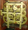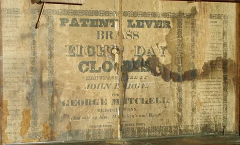 John Birge for George Mitchell, Bristol, Conn., 8 days, time and strike, early Ives'-style strap movement (2-wt), triple decker shelf clock, c1831.