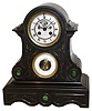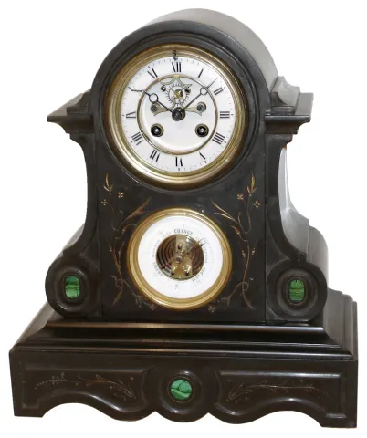 French black slate and malachite 8 days, time and strike, mantel clock with visible escapement and inset barometer, c1900 the case finish is somewhat dull, the gold accents still are visible, but there are some edge chips especially at the bottom right corner. The porcelain dials are good, with just a small crack through the 12, and the beveled glasses are okay. The clock back plate is signed Marti behind the bell; the pallets are red jewels. Ht 13.25"