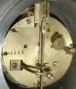 the case finish is somewhat dull, the gold accents still are visible, but there are some edge chips especially at the bottom right corner. The porcelain dials are good, with just a small crack through the 12, and the beveled glasses are okay. The clock back plate is signed Marti behind the bell; the pallets are red jewels. Ht 13.25"
