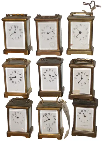 Clocks- 9 (Nine) Carriage French 8 days, one time/alarm and eight time-only; 4 cylinder platforms, 5 lever retailer names on dials include Bigelow Kennard, Tilden Thurber, and J.J. Freeman (Toledo, Ohio). All complete except for one with missing rear door and few missing glass panels. None tested, sold as is, no further information available