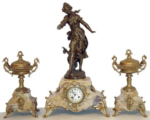 French 3 piece mantel garniture, multi colored marble clock case with gilt rococo style ornament, mounted with a patinated figure of a young woman entitled "Les Favoris", after a sculpture by Aug. Moreau, side pieces with covered urns mounted to marble bases matching the clock case, the urn handles with birds, all on gilt acanthus decorated scroll feet, the bezel with thick beveled glass, Arabic numeral white enamel dial with polychrome floral decoration, blued steel hands, 8 days, time and strike, Pendule a Paris movement marked Samuel Marti, c1900 case castings good, figure with restoration to finish, crack in casting at base of tree trunk under figure, also missing something, originally held in her right hand, other mounts on clock case and all on side pieces now painted gold, one urn with bird beaks broken, one base with chip in stone and loss to top of foot casting, back left, stone has been lacquered, with runs and orange peel, dial good, hands good, hand collet missing, ticks and strikes, Ht 25"