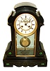 French black slate mantel clock, the front with malachite inlays and gilt incised line decoration, gilt bezel case front and back with beveled glass, Roman numeral white enamel dial with recessed center, and exposed Brocot escapement, blued steel Breguet style hands, 8 days, time and strike, Pendule a Paris movement marked S. Marti, pendulum with large brass ball and steel rod, c1880 case with a few minor flakes, malachite inlay at center of base missing, bezel, glass frames, and pendulum painted gold, dial with hairlines, hands with minor oxidation and loss of blue, hand washer and taper pin missing, movement back plate painted gold, ticks and strikes, Ht