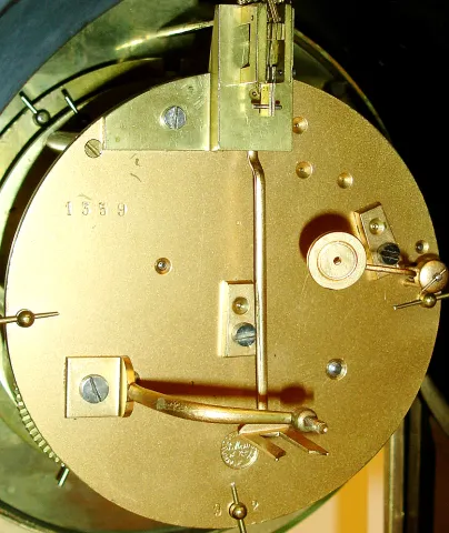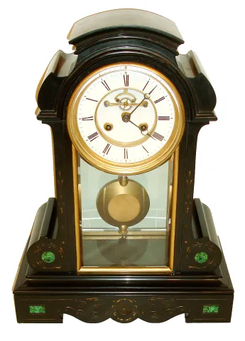 case with a few minor flakes, malachite inlay at center of base missing, bezel, glass frames, and pendulum painted gold, dial with hairlines, hands with minor oxidation and loss of blue, hand washer and taper pin missing, movement back plate painted gold, ticks and strikes, Ht