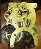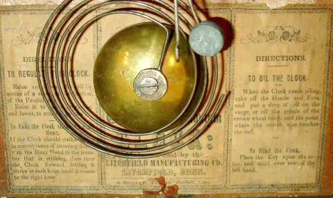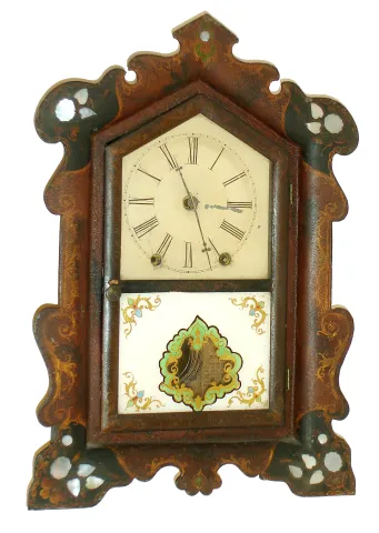 Litchfield Mfg. Co., Litchfield, Conn.8 days, time and strike, movement iron front shelf clock with MOP, c1854 Nice cast iron front with MOP inlaid case with original finish which has darkened with age. Original dial with paint loss at the mounting pins and at 3 o'clock. The hands are original. Both glasses are original with some restoration to the lower glass. Very nice label inside the case. Unlike most Litchfield movements which are balance wheel, this one has a rarely found anchor escapement. Plate shape is typical of all Litchfield movements. Ht 17.75".