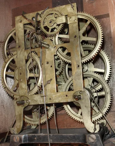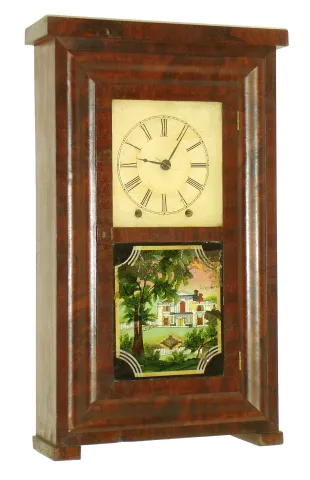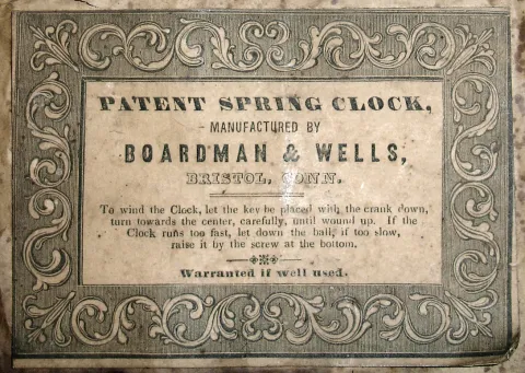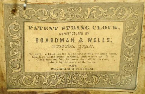 Boardman & Wells, Bristol, Conn., 8 days, time and strike, fusee brass movement small size OG form shelf clock, c1843 Mahogany veneered case in an old and possibly original finish with some veneer loss on the feet, at the door lock, a small piece on the top and shrinkage cracks on the door. Original painted dial with some loss at the mounting screws, in the center, in a couple small places at the bottom edge and a chip at 5 o'clock. The wood fusees have some damage on the edges. The movement is signed. Original tablet with some loss. Hands are replacements. A very nice small square label inside the case. Ht 23.25"