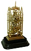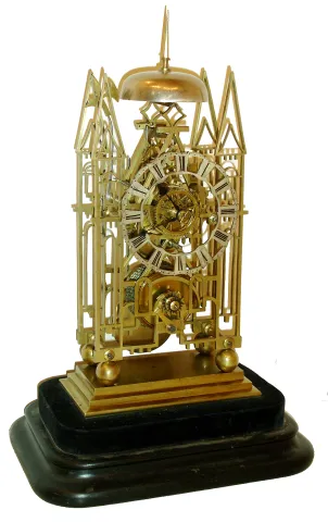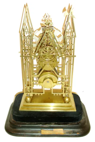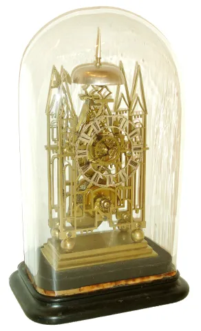 J. Smith and Sons Clerkenwell, [attributed] skeleton clock, cathedral form plates with delicate piercing and decorative turned baluster form pillars, on ball feet and with stepped base, engraved Roman numeral silvered dial with pie crust edge, blued steel hands, brass pendulum with decorative star form steel ornament at center, 8 days, single fusee movement with recoil escapement and passing strike, all mounted to a velvet lined ebonized wooden base with glass dome, c1850 Plates and stepped base dirty and with minor tarnish and spotting, support for bell stand broken, plates with minor bends, repaired break in frame to left of barrel arbor, arch shaped component added for support, and a similar piece added at right for symmetry, movement ticks, dirty and oily, needs service, strike hammer tail loose on arbor, hammer arm bent to clear bell, needs repair, wooden base with wear and minor losses, dome good. Note design of pendulum and baluster pillar shape are uniquely Smith and Sons. Ht15"