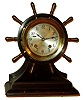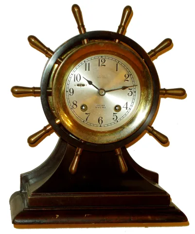 Chelsea Clock Co., Boston, for Negus, New York, 4" dial "Yacht Wheel" 8 days, ship's bells bronze, brass and mahogany hinged bezel mantel clock, #605437, c1957