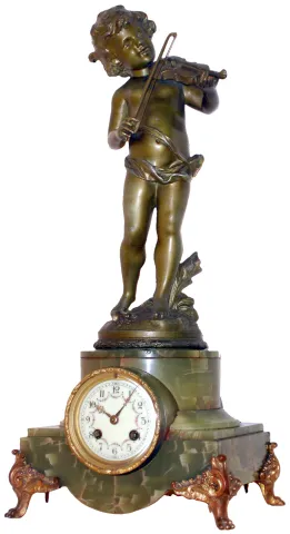 French green onyx and cast metal figural 8 days, time and strike, mantel clock, statue signed Aug. Moreau, c1900 the stone base and spelter figure all are in very nice condition, with an old bronzed surface on the statue and a few small cracks, as usual, in the onyx. The porcelain dial, with multicolor garlands, and the beveled glass also are fine. The Marti movement has count wheel and bell striking. Ht 21"