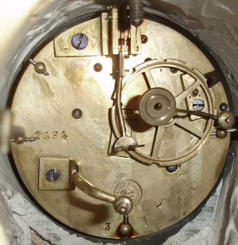 the stone base and spelter figure all are in very nice condition, with an old bronzed surface on the statue and a few small cracks, as usual, in the onyx. The porcelain dial, with multicolor garlands, and the beveled glass also are fine. The Marti movement has count wheel and bell striking. Ht 21"