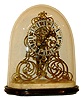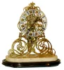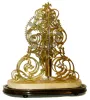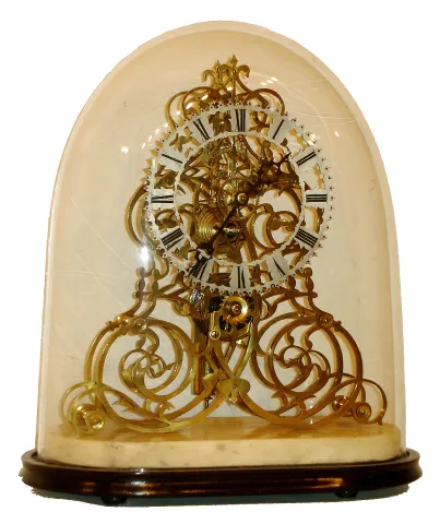 clock is mounted to a piece of marble, now resting on a shaped wooden base with old glass dome. The clock is clean and running. Dome is good with no cracks. Movement has a 6 spoke hour wheel, however train wheels are 4 spoke; motion gears are not spoked. Although this is a known frame, it is not pictured in our skeleton literature [Roberts nor Royer-Collard]. Ht of frame = 14", overall ht = 18"