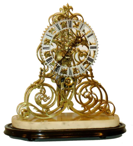 English, single fusee skeleton timepiece, in an extra fancy scrolling frame, with pierced silvered dial and glass dome, c1870 clock is mounted to a piece of marble, now resting on a shaped wooden base with old glass dome. The clock is clean and running. Dome is good with no cracks. Movement has a 6 spoke hour wheel, however train wheels are 4 spoke; motion gears are not spoked. Although this is a known frame, it is not pictured in our skeleton literature [Roberts nor Royer-Collard]. Ht of frame = 14", overall ht = 18"