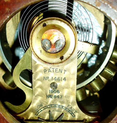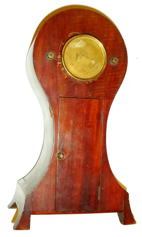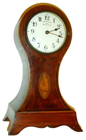 Eureka Clock Co., Ltd., London, 1000 day electric clock in a mahogany veneered Sheraton style balloon case, with line inlays, cross banding and marquetry conch shell, brass bezel with convex beveled glass, Arabic numeral white enamel dial signed "Eureka Clock Co., Ltd., London, 1000 Day Electric Clock", blued steel spade hands, spotted brass movement with large bimetallic balance, the rating assembly accessed through a brass cover in the case back, serial #2847, c1910 case with marks, dings and scratches, right side with minor split and veneer chip, roughly 3/4" x 1", front with minor inlay loss, top faded, back with scratches from prying movement cover, bezel with dirt and tarnish, dial dirty, otherwise very good, hands with minor oxidation, movement good, balance free, running condition unknown, Ht 14"