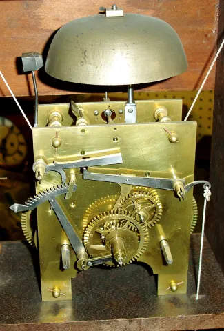 Unknown, Pennsylvania, 8 days, time and strike, weight brass movement half column & splat shelf clock, c1833. Case looks to have been locally made based on a Connecticut example because the method of construction is different from those made in