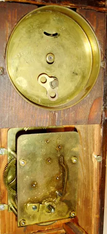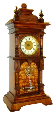 German, Novelty Waterfall or fountain clock. The miniature tall style case with timepiece movement at top, and a separate spring driven movement in the bottom, actuated at will to drive the twisty glass rod that simulates water, c1900