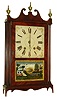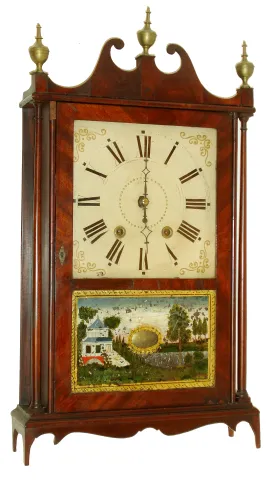Mahogany veneered case with remains of original finish has veneer loss and some age cracks on the door. A small piece of the half round molding on the upper left corner is missing. Feet and bottom skirt are replacements. Wood dial is old, but from a later half-column clock. Scrolls are original with some lifting of the veneer. Movement is original to the case. Cracked original tablet has a glass behind to protect what remains. Hands are original. Dark but readable label inside the case. Original set of finials. Key escutcheon has been replaced with a brass insert. Ht 29"