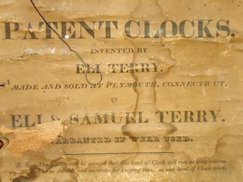 Eli and Samuel Terry, Plymouth, Conn., 30 hours, time and strike, weight wood movement pillar & scroll shelf clock, c1825