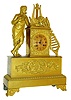 French gilt bronze figural mantel clock, robed male figure playing a flute and with lyre, pan flute, other wind instruments and floral wreaths, Roman numeral gilt dial with acanthus surround, base with trophy composed of wind instruments, laurel, and interlocking wreaths, with acanthus and floral medallion decorated scroll feet, 8 days, time and strike, Pendule a Paris movement with silk thread suspension, blued steel Breguet style hands, c1830 Case with good gilt surface, but with minor wear and scratches, dirt and some verdigris, rear feet with tarnish and verdigris, figure with broken finger, some of the ornament (pipes, wreaths) now attached with glue, other ornaments including figure loose, and need to be secured, minor scratches and spotting on dial, numerals with minor losses, hands with oxidation, rust, movement ticks and strikes, needs cleaning, pendulum rod broken, Ht 18"