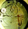 Case with good gilt surface, but with minor wear and scratches, dirt and some verdigris, rear feet with tarnish and verdigris, figure with broken finger, some of the ornament (pipes, wreaths) now attached with glue, other ornaments including figure loose, and need to be secured, minor scratches and spotting on dial, numerals with minor losses, hands with oxidation, rust, movement ticks and strikes, needs cleaning, pendulum rod broken, Ht 18"