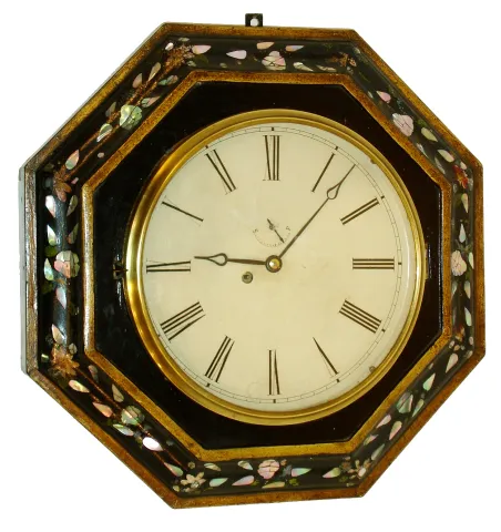 Litchfield Mfg. Co, Litchfield, Conn.8 days, paper mache with MOP octagon gallery timepiece, c1851.