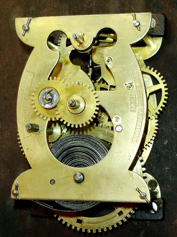 the case is in nice original condition with minor wear to gold border on outer edge; original painted dial with minor paint loss at center and winding arbor and outer edge of the rim with three small areas of in-painting. The brass bezel may be a replacement. This is very scarceand the largest size Litchfield wall clock model. The original hands are present including Fast / Slow setting hand. Ht 20";