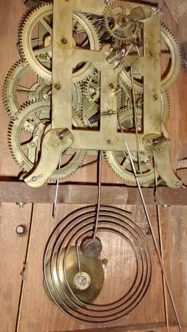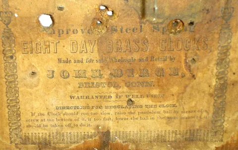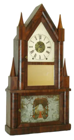 John Birge, Bristol, Conn., 8 days, time and strike, detached fusee steeple on frame or double steeple shelf clock, c1848. John Birge was on his on his own in 1848 after the death of Fuller and continued to make clocks with movements from the old firm.