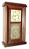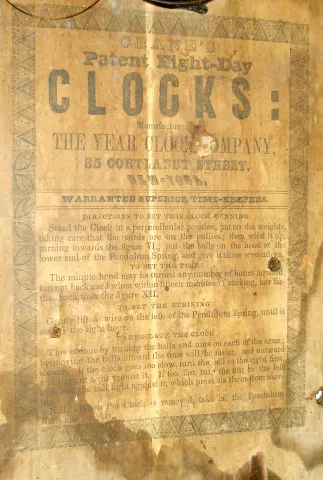 J. R. Mills & Co., New York, "Year Clock Co"., two weight, 8 days, shelf clock, torsion suspension and 3-ball pendulum, in a walnut case, c1850 the top dust cover got lost and Dr. Shaffer made a new one and veneered same, attaching it to the 2 original hinges. That dust cover is simply raised for stringing cord across the wooden rollers. Case, except for very top, retains original crazed finish. Dial, etched tablet and label are original. Unfortunately the 3-ball pendulum is home-made, and is slightly too large in diameter, such that it interferes with the case back and door glass. Ht 21"