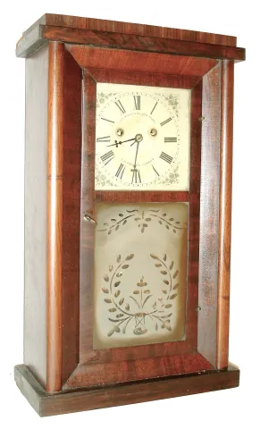 J. R. Mills & Co., New York, "Year Clock Co"., two weight, 8 days, shelf clock, torsion suspension and 3-ball pendulum, in a walnut case, c1850