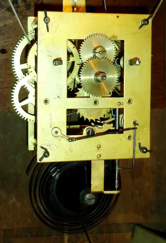the top dust cover got lost and Dr. Shaffer made a new one and veneered same, attaching it to the 2 original hinges. That dust cover is simply raised for stringing cord across the wooden rollers. Case, except for very top, retains original crazed finish. Dial, etched tablet and label are original. Unfortunately the 3-ball pendulum is home-made, and is slightly too large in diameter, such that it interferes with the case back and door glass. Ht 21"