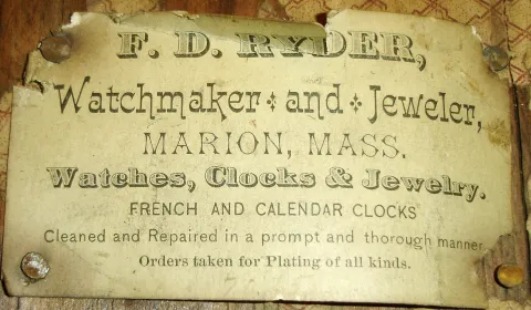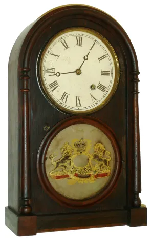 Rosewood veneered case in original finish and very nice condition. Small chip under upper door frame. Original tablet with some loss. Original painted dial with some loss at the mounting screws and the winding arbor. Hands are period but may not be original. Interesting card label from a Marion. MA jeweler tacked inside. This case (with brass top bezel and wood bottom one) was patented by Noah L. Brewster. The movement was made by Noah Pomeroy (according to one with a tag dated 1890 - when Pomeroy was still alive). Ht 17.75".