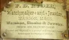 Noah Pomeroy (attributed to), Bristol, Conn., 8 days, fusee, time only, rosewood veneered case, c1865. This clock was pictured in "A Survey History of the American Spring Driven Clock 1840-1860", a supplement to the NAWCC Bulletin, No. 9, Winter 1973, p45. Rosewood veneered case in original finish and very nice condition. Small chip under upper door frame. Original tablet with some loss. Original painted dial with some loss at the mounting screws and the winding arbor. Hands are period but may not be original. Interesting card label from a Marion. MA jeweler tacked inside. This case (with brass top bezel and wood bottom one) was patented by Noah L. Brewster. The movement was made by Noah Pomeroy (according to one with a tag dated 1890 - when Pomeroy was still alive). Ht 17.75".